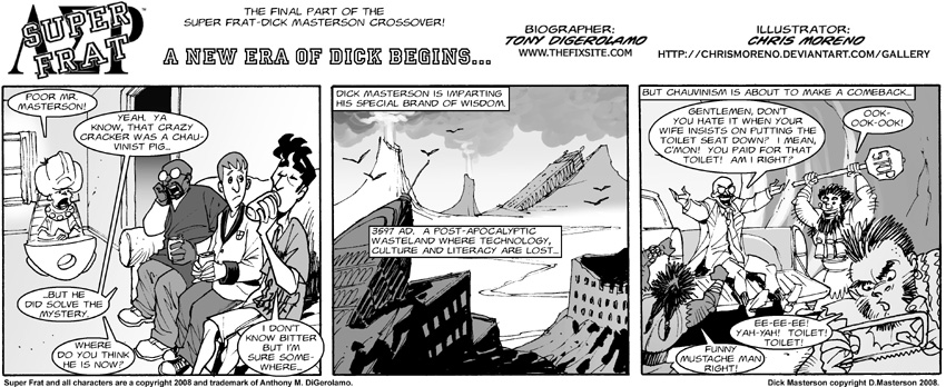This completes the Dick Masterson crossover! Will Dick return to the campus of Ryesmore? Someday perhaps. I’d like to thank Dick and his staff for lending his manly image to Super Frat. The bros say you’re welcome down at the Frat House any time!