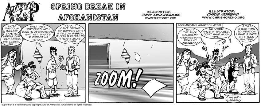 Welcome to another Super Frat milestone. I’ve been wanting to do this storyline for quite sometime. The virulent antiwar critic, Ira, stuck in Afghanistan. How will a superpowered antiwar protester use his super powers in the battlefield? Can the boys save the troops? And just how high is Mistah Shit? Find out in the coming weeks!